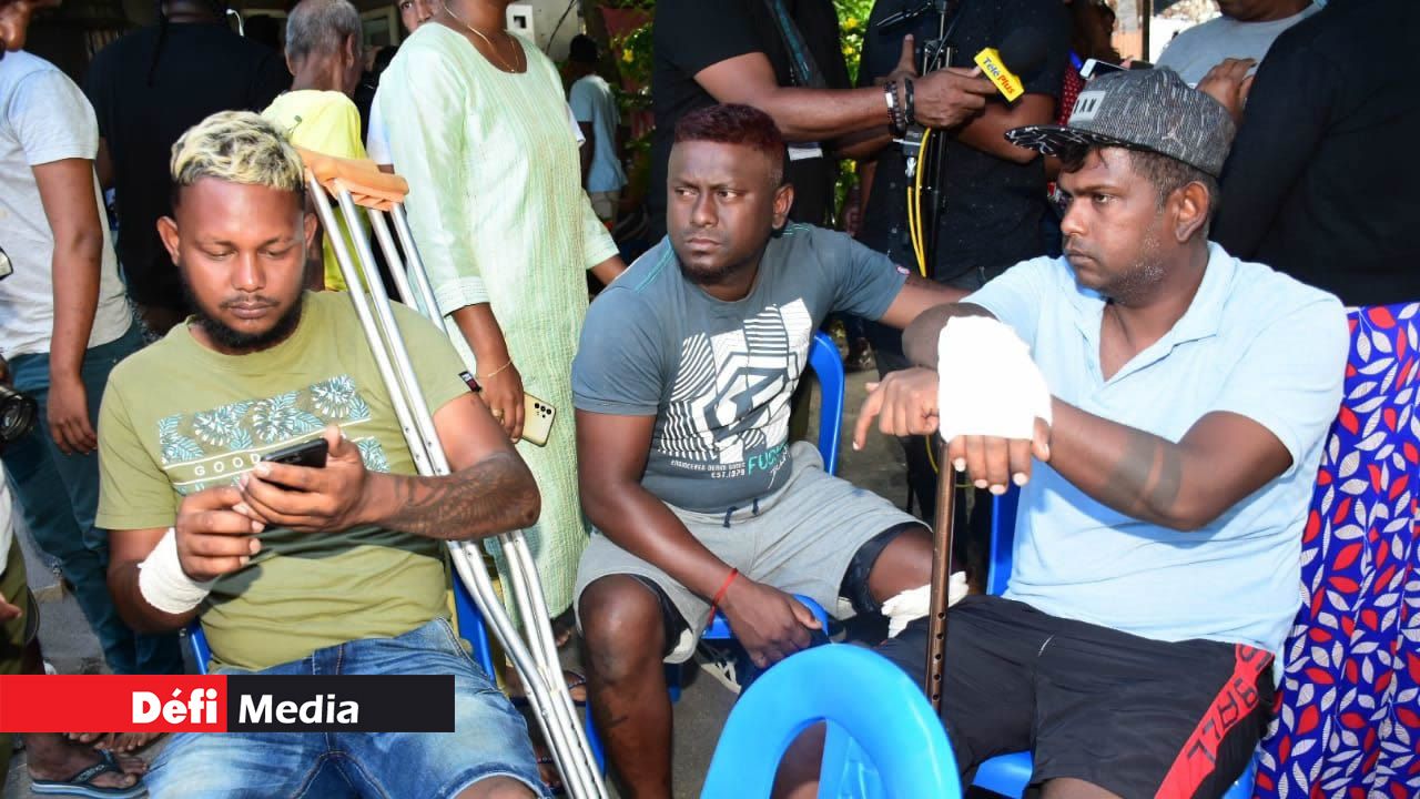 Grièvement brûlé au niveau des pieds et des mains, se déplaçant à l’aide de béquilles, il était présent aux funérailles de ses « frères » Rohan Doorjean, 22 ans, et Parmeshwar Dhookeeya, 35 ans, vendredi.