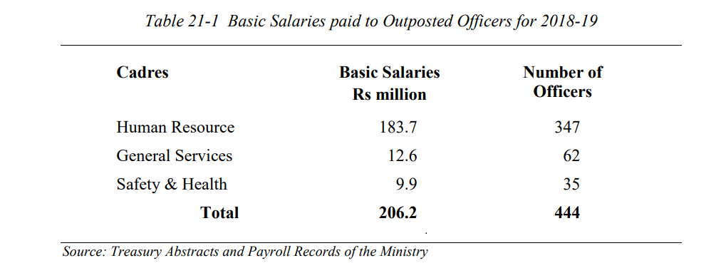 Le rapport indique que le coût réel des salaires directement imputable au ministère aurait dû être de Rs 109.8 millions payables à 285 officiers au lieu de Rs 316 millions.