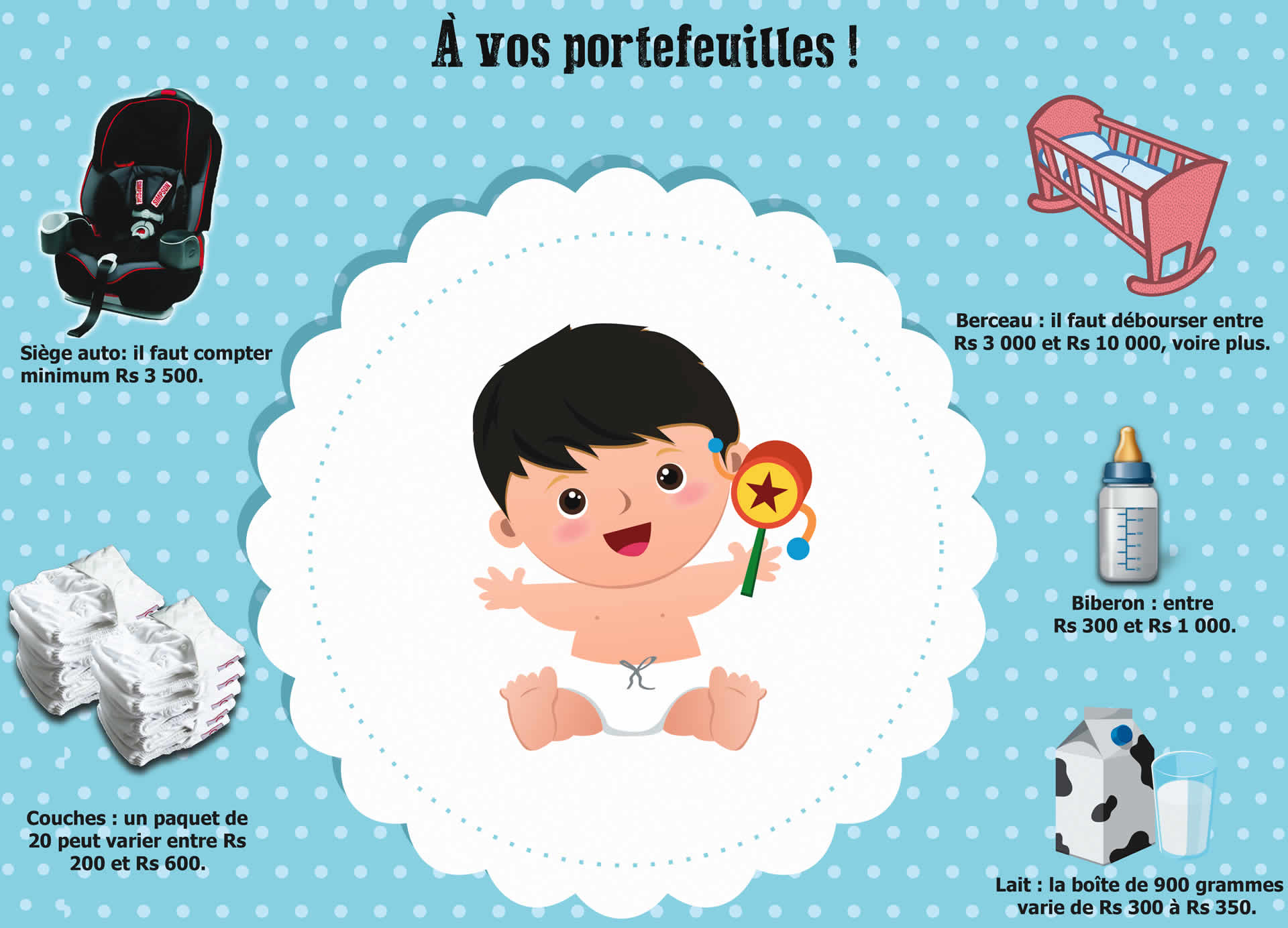 Devenir parent est magique. Mais au-delà des émotions, avoir un enfant comporte bien des responsabilités. Et des dépenses… Combien l’arrivée de bébé ? La question est relative. Cela dépend des revenus des parents, mais aussi de la qualité des produits qu’ils veulent utiliser pour leur bébé. Cependant, il existe une liste de produits de base à laquelle les futurs parents doivent s’y plier et, bien souvent, sur un plan hebdomadaire. En tête de liste, nous retrouvons le lait. Il faut compter entre Rs 300 et Rs 350 la boîte de 900 grammes. Cela coûte encore plus cher, si c’est un lait spécialisé, comme le lait anti-régurgitation, par exemple. Pour les couches, c’est une autre paire de manches. Contrairement au lait, les prix varient selon la marque allant du plus bon marché au très cher. Pour un paquet de 20 couches, le prix peut varier entre Rs 200 et Rs 600. Ensuite, nous retrouvons les vêtements. Si on a envie d’économiser en optant pour une marque moins prestigieuse, il faut quand même comprendre que pour les bébés et les enfants, il faudra acheter de nouveaux vêtements tous les trois ou six mois. Ce qui nécessite un budget. Il faut aussi penser aux biberons, aux médicaments pour calmer les coliques de bébé et les pommades, entre autres.Quid des accessoires ?
