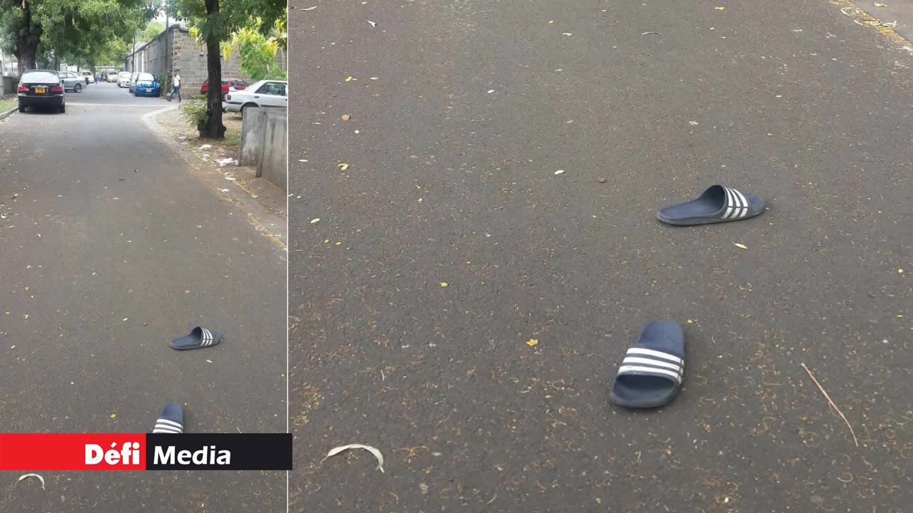 Les savates du suspect sont restées dans la cour du bureau de la CID Port-Louis-Nord [Photo Vel Moonien]