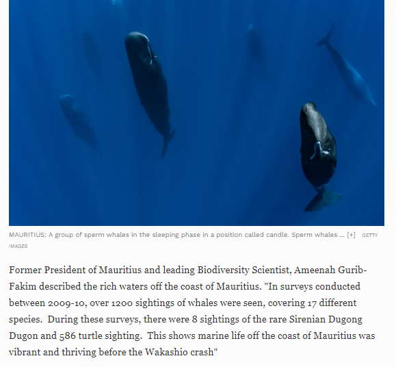 Dans son article, Nishan Degnarain a également reproduit des recherches d’Ameenah Gurib-Fakim, ancienne présidente de la République et scientifique, qui aurait entre 2009 et 2010, observé plus de 1200 baleines, et a distingué 17 différentes espèces. Parmi le fameux Dugong, une espèce de baleine gravement menacée.