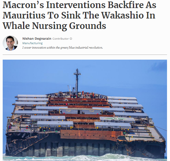 Le magazine économique américain Forbes s’interroge sur la décision des autorités de couler l’épave du MV Wakashio à 8 milles nautiques des côtes mauriciennes. Cela pourrait être une menace pour les baleines et les thons, selon Nishan Degnarain, l'auteur d'un article. Lequel a été publié mardi 18 août sous le titre : « Macron’s Interventions Backfire As Mauritius To Sink The Wakashio In Whale Nursing Grounds.»
