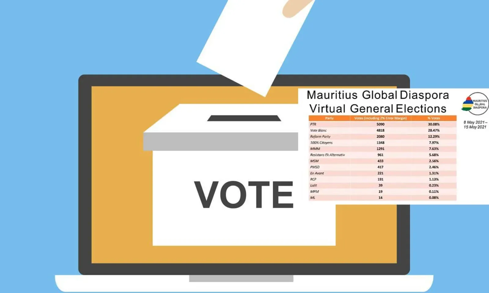 Avec 5 090 votes, le Parti travailliste a été élu en tête de liste lors de l’élection virtuelle de la diaspora mauricienne le samedi 15 mai, ce qui constitue 1,1 % de la diaspora. Car, sur les quelque 450 000 Mauriciens de la diaspora, seulement 17 267 votes ont été validés. En revanche, le MSM, parti politique au pouvoir, s’est classé en 7e position après le parti de gauche Rezistans ek Alternativ, MMM, 100 % Citoyen et Reform Party. Le Muvman Liberater est en dernière position.