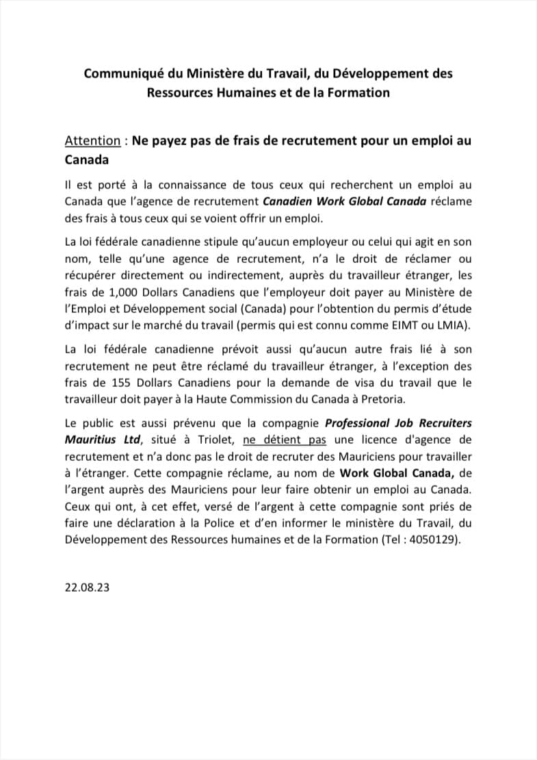 Les fraudes et arnaques pour immigrer ou travailler au Canada se multiplient. Plusieurs plaintes ont été enregistrées au ministère du Travail contre « Professional Job Recruiters Mauritius Limited ». Cette compagnie située à Triolet, au nom de « Work Global Canada » réclame de l’argent auprès des Mauriciens en échange d’un emploi au Canada.