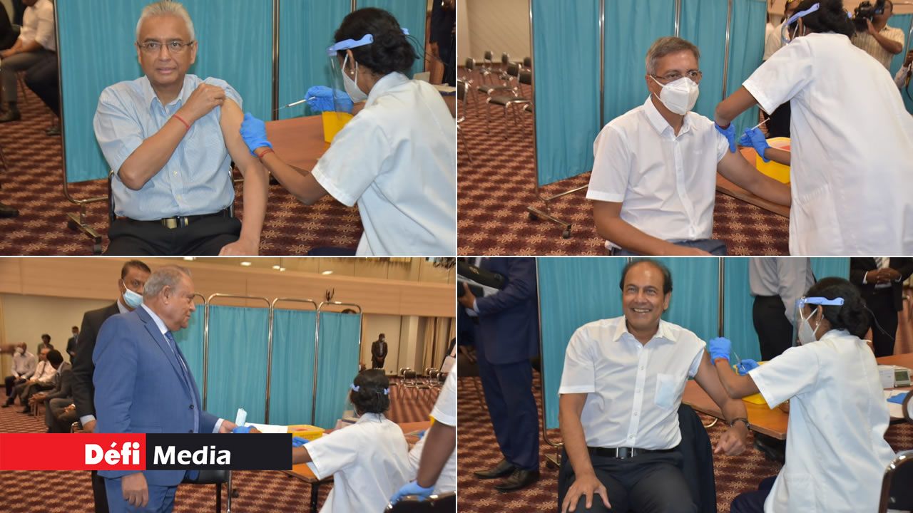 Le Premier ministre, Pravind Jugnauth, le Speaker de l’Assemblée nationale, Sooroojdev Phokeer, et des ministres se sont rendus au Sir Harilall Vaghjee Hall, Port-Louis, cet après-midi, vendredi 5 mars, pour se faire vacciner contre la Covid-19. Ils ont reçu leur première dose du vaccin Covishield d’AstraZenecca du Serum Institute of India. Le leader de l'opposition, Xavier-Luc Duval, a aussi été vacciné.