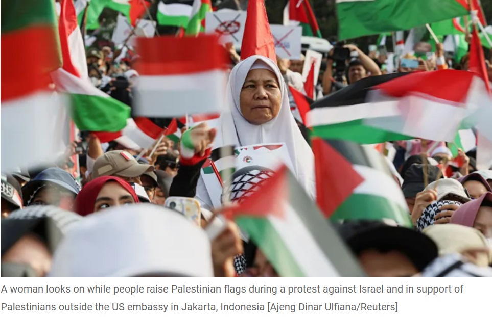 Dans la capitale indonésienne, Jakarta, plus de 1 000 manifestants pro-palestiniens se sont rassemblés devant l'ambassade des États-Unis, exigeant que Washington, principal fournisseur d'armes et allié d'Israël, cesse d'envoyer des armes à Israël.
