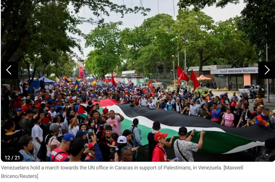À Caracas, des centaines de manifestants pro-palestiniens ont protesté devant le siège des Nations Unies pour le Venezuela, arborant un immense drapeau palestinien. Ils ont remis une pétition à l'ONU appelant à la fin du « génocide » des Palestiniens.