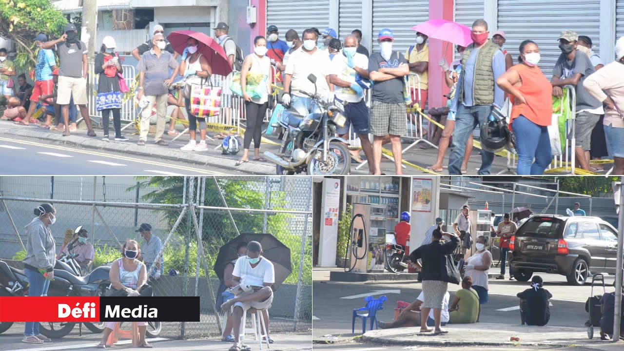 Ceux présents parmi cette foule ce matin portent toutefois leur masque. Si certains n’ont pas oublié leurs parasols pour se protéger du soleil, d’autres ont redoublé d’ingéniosité en ramenant leur tabouret. Chacun essaie du mieux qu’il peut de se frayer une place au soleil au détriment du «social distancing».