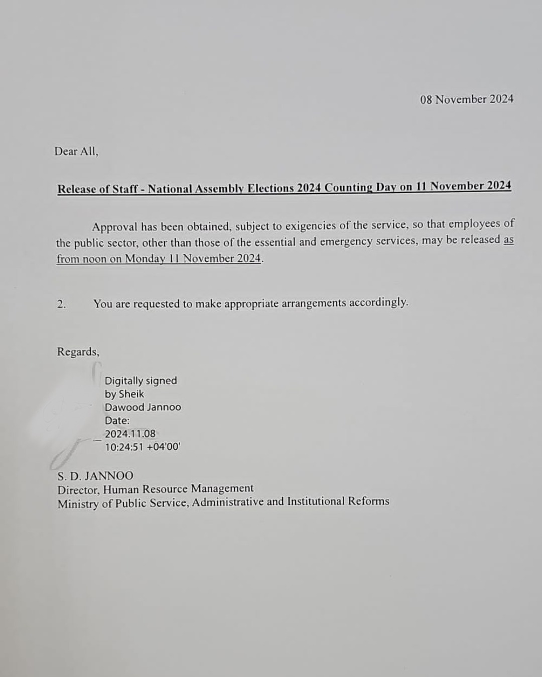 Les employés de la fonction publique seront autorisés à rentrer chez eux à partir de midi le 11 novembre, jour du dépouillement des votes. Cependant, cette décision du ministère de la Fonction publique ne s'applique pas aux agents des services essentiels.