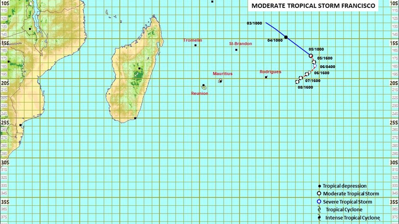 A 04h00 ce jeudi 6 février, la tempête tropicale modérée Francisco était centrée en latitude 18.0 degrés Sud et longitude 71.4 degrés Est soit à environ 1 445 km à l'est-nord-est de Maurice.