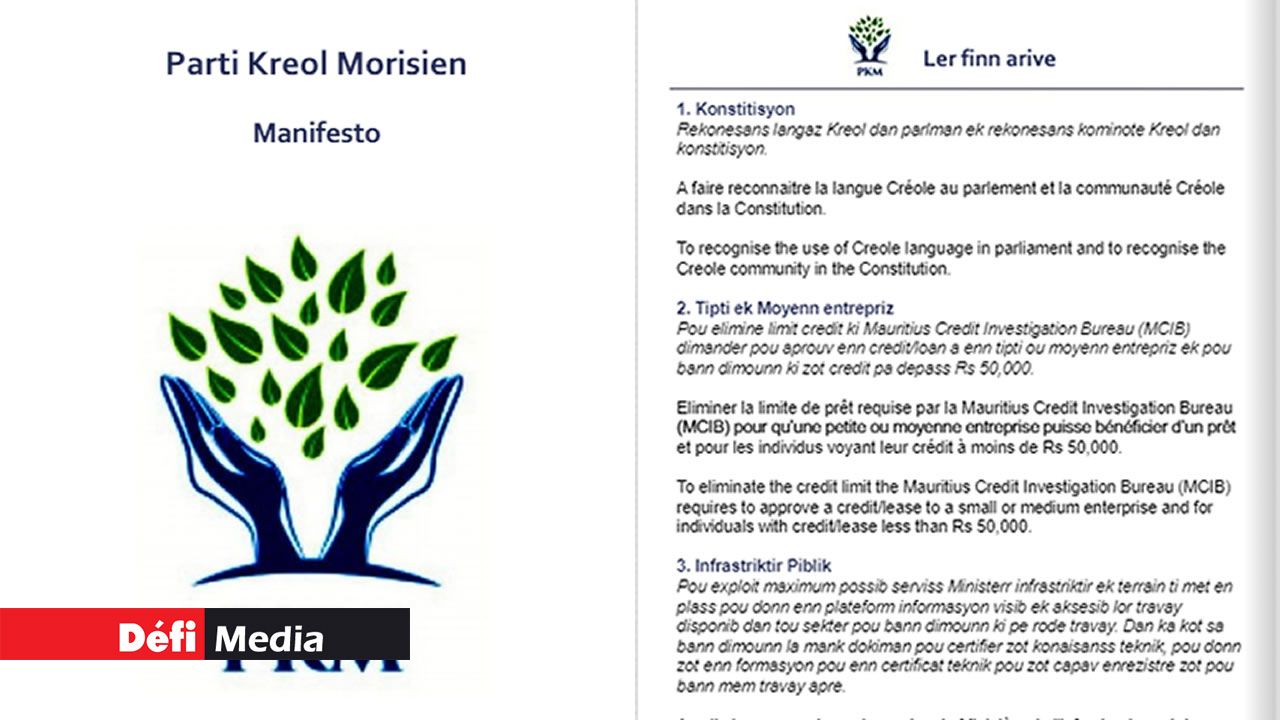 Le Parti Kreol Mauricien (PKM) a dévoilé le contenu de son manifeste électoral en marge des législatives 2019 du jeudi 7 novembre. 19 mesures ont été annoncées, comme notamment «la reconnaissance de la langue créole au Parlement et faire reconnaître la communauté créole au sein de la Constitution.