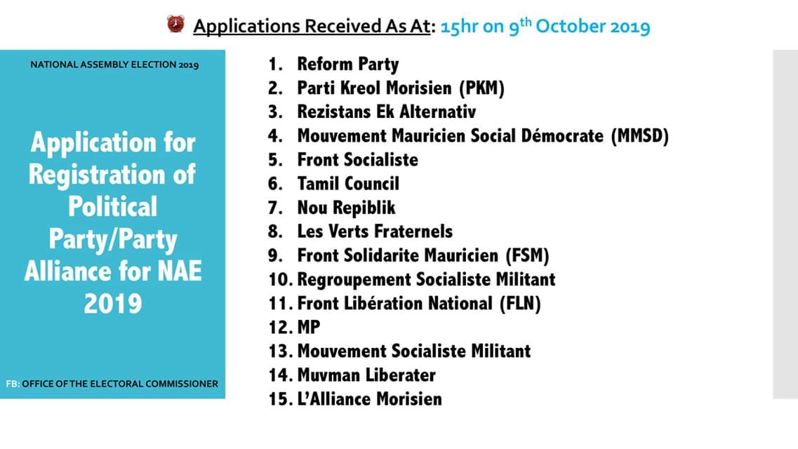 Selon le commissaire électoral, Irfan Raman, seuls les partis du MSM et ML se sont enregistrés comme «L’Alliance Morisien» (MSM/ML). Le Commissaire électoral a aussi indiqué que la liste définitive sera finalisée le samedi 12 octobre prochain.