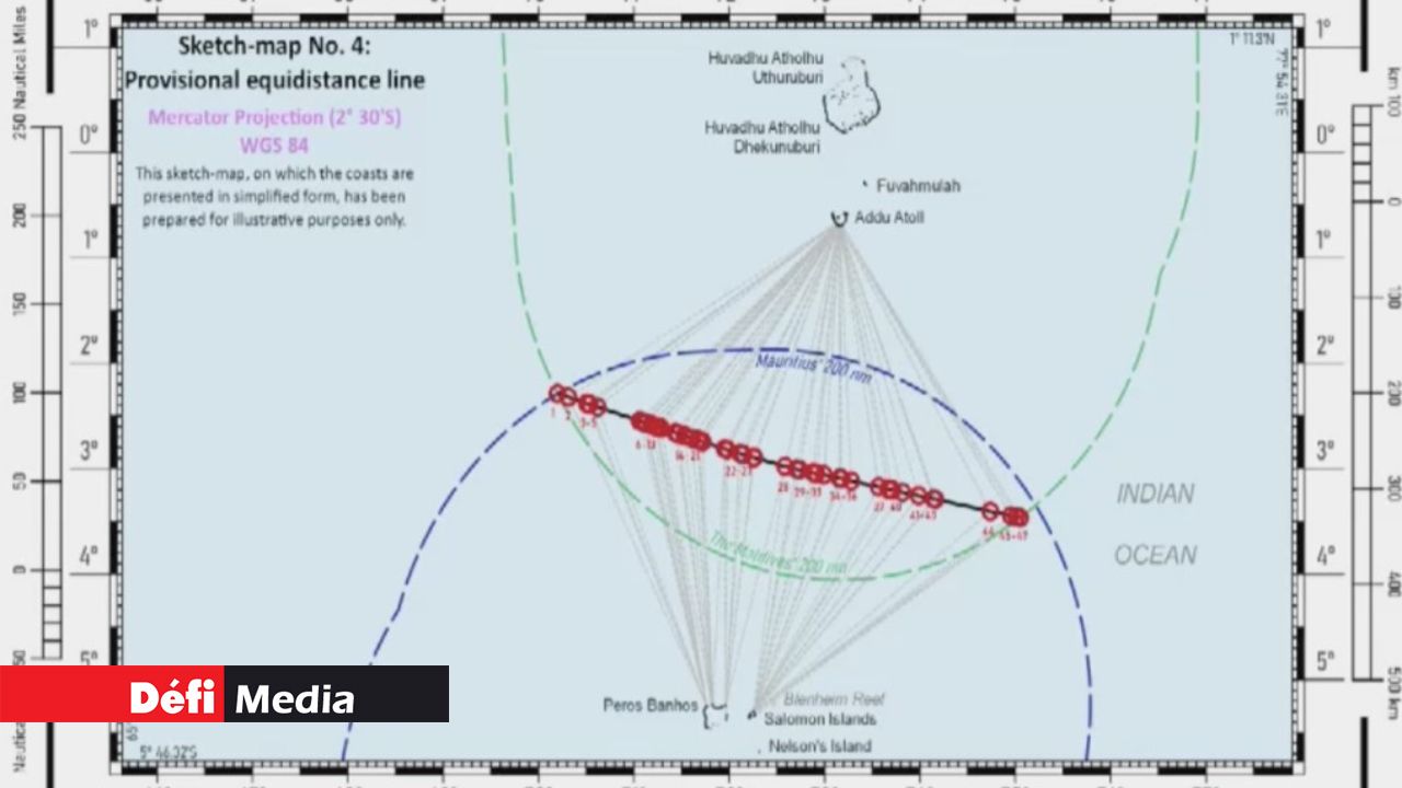 En avril 2023, le TIDM a décidé que la zone en chevauchement devait être partagée en utilisant la méthode de l’équidistance, en excluant tout point sur le récif de Blenheim. Par conséquent, 47 232 km2 ont été attribués aux Maldives et 45 331 km2 à Maurice.