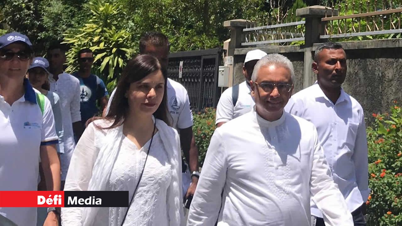 Pour les besoins de la marche, longue d’environ 17 km, le couple a troqué les chaussures classiques pour des chaussures de sport, tout en se revêtant du blanc de rigueur. Le PM porte le vêtement traditionnel, un kurta, Kobita Jugnauth étant habillée d’un churidar.