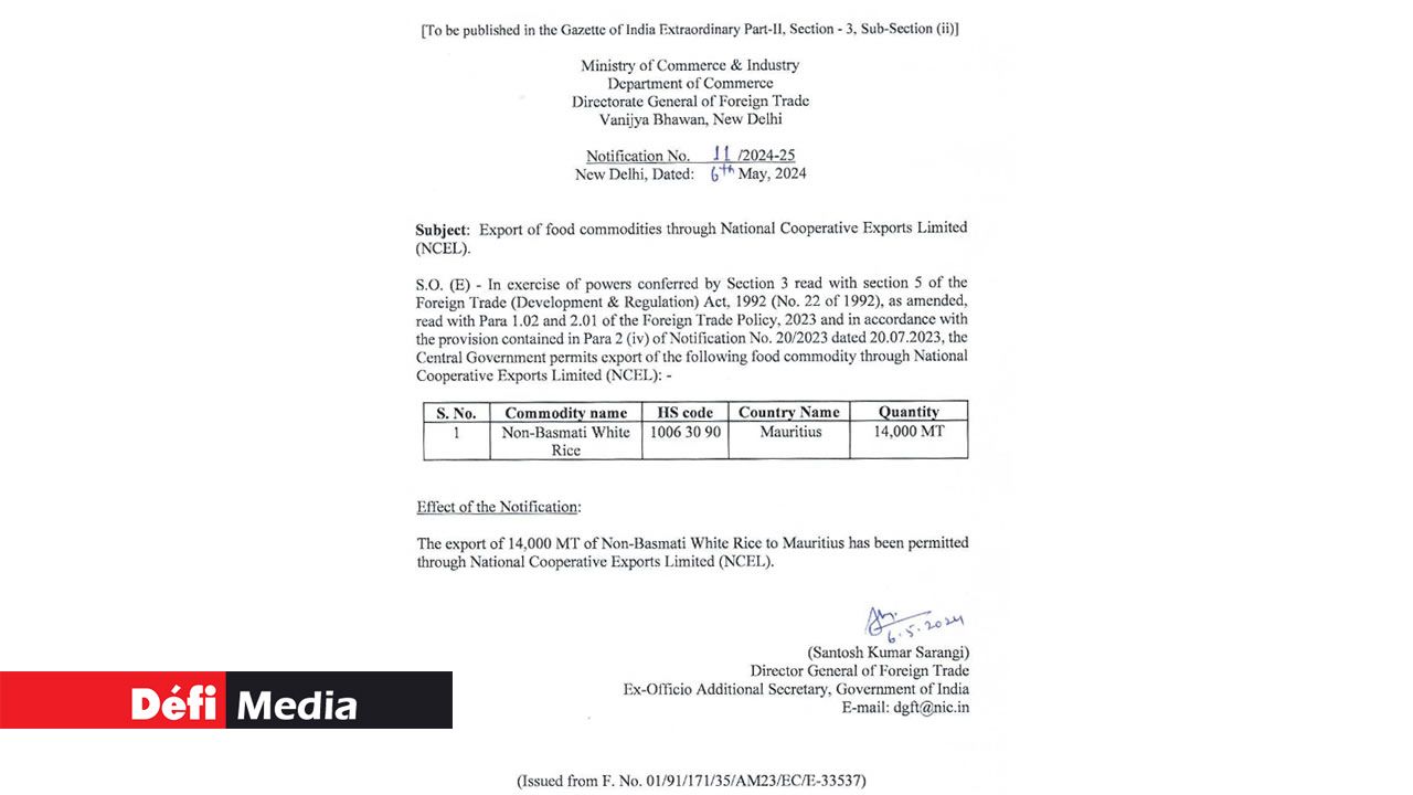 L’exportation de riz blanc non-basmati a été interdite en juillet 2023 par le gouvernement indien pour contrôler les prix intérieurs et garantir la sécurité alimentaire intérieure. Toutefois, le gouvernement a permis l’exportation de 14 000 tonnes métriques de riz blanc non-basmati vers Maurice. C’est ce qu’indique une notification officielle de la Direction générale du commerce extérieur du ministère indien du Commerce et de l’Industrie en date du 6 mai.