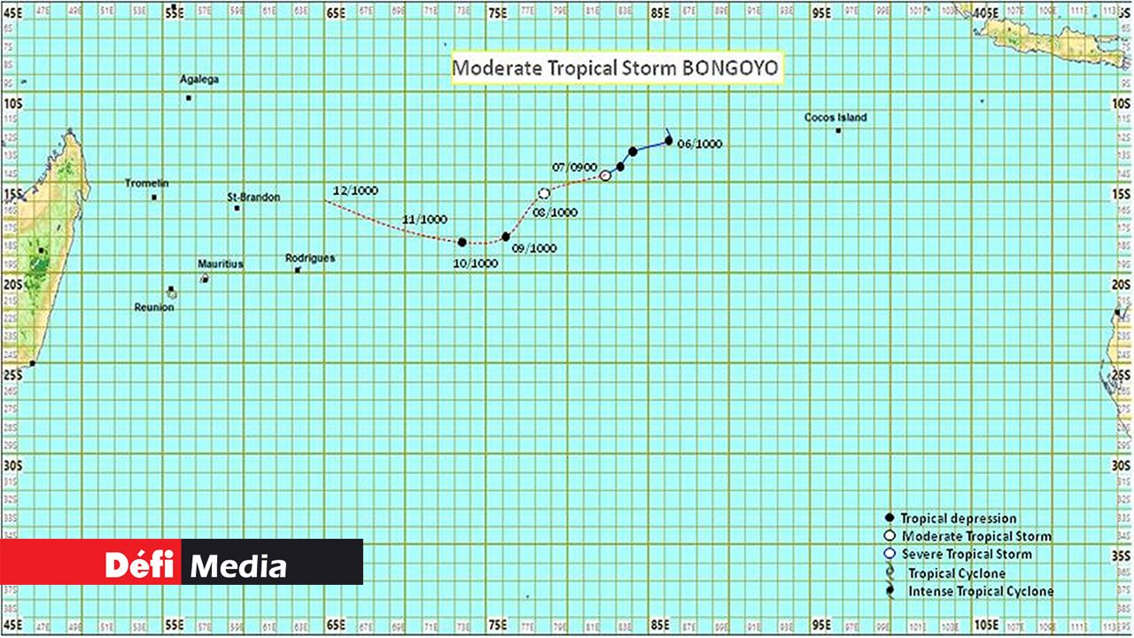 « A 16 h cet après-midi, la tempête tropicale modérée, Bongoyo, était centrée autour du point 15.0'S en latitude et 81.2'E en longitude, très loin soit à 2 575 kilomètres à l'est-nord-est de Maurice. Elle se déplace dans une direction de l'Ouest-Sud-Ouest à environ 20 km/h ». C’est ce qu’indique le bulletin des prévisions de la station météo de Vacoas, émis en fin d’après-midi de ce lundi 7 décembre.