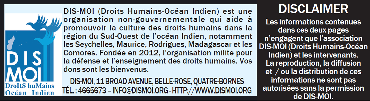 Sur le plan travail, DIS-MOI Comores adopte la formule de 5C du travail en équipe; explique le président de l’OING, Fayal Mohamed. « Notre pouvoir est de savoir se défendre et savoir respecter les droits des autres.» Ce jeune juriste insiste que DIS-MOI a des « ambitions immédiates d’obtenir plus de 500 signataires de la charte de l’Amicale des peuples de l’Océan d’ici octobre. »
