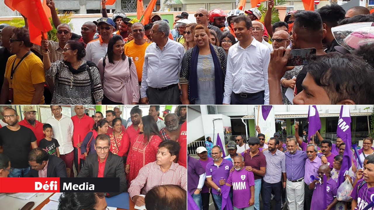 À midi, les trois candidats du Mouvement militant mauricien (MMM), Reza Uteem, Reza Gunny et Nabil Moolna, ont défilé de la station-service de la rue Labourdonnais jusqu’au Nomination Centre. Ils étaient accompagnés d’une soixantaine de partisans munis de vuvuzelas mauves, de ravannes et de banderoles floquées du slogan « Pour un vrai changement ». Si Reza Uteem briguera les suffrages pour la troisième fois au no 2, ses deux colistiers découvrent, eux, les élections générales. Une ambiance bon enfant régnait au centre d’enregistrement après le départ des Mauves. Il a fallu attendre 14h et l’arrivée des candidats de l’Alliance Morisien et de ses partisans pour que l’école Raoul Rivet s’anime de nouveau. Zouberr Joomaye, Shakilla Jhungeer et Abdullah Hossen ont défilé sur une cinquantaine de mètres avant d’aller déposer leur candidature.