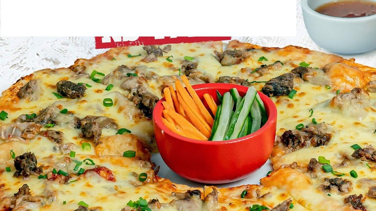 Les morceaux de canard laqué et d’autres ingrédients traditionnels sont étalés sur la pâte à pizza. Elle est servie avec un bol de légumes coupés en julienne comme la carotte et le concombre. Ainsi qu’une sauce qui complémente le tout, indique-t-il.