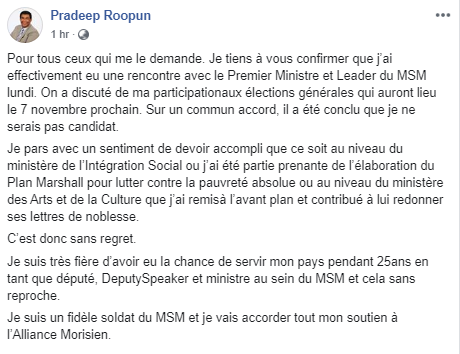 Cela, après que Pradeep Roopun n’ait pas obtenu de ticket pour briguer les suffrages des élections pour ces législatives de 2019. Pradeep Roopun a aussi précisé avoir eu une rencontre, lundi dernier, avec Pravind Jugnauth. «Selon un commun accord, il a été conclu que je ne serai pas candidat».