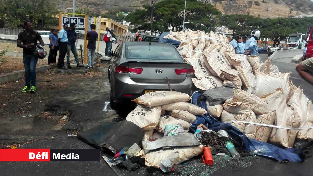 La police des Line Barracks et les pompiers de la caserne de Port-Louis ont été mandés. « Les soldats du feu ont dû scier le volant pour m’extraire de la cabine du poids lourd », confie Linsay. Un couple à motocyclette a également été touché. Mari et femme ont chuté de leur moto. Une voiture, qui roulait derrière eux, a aussi été atteint par les sacs.