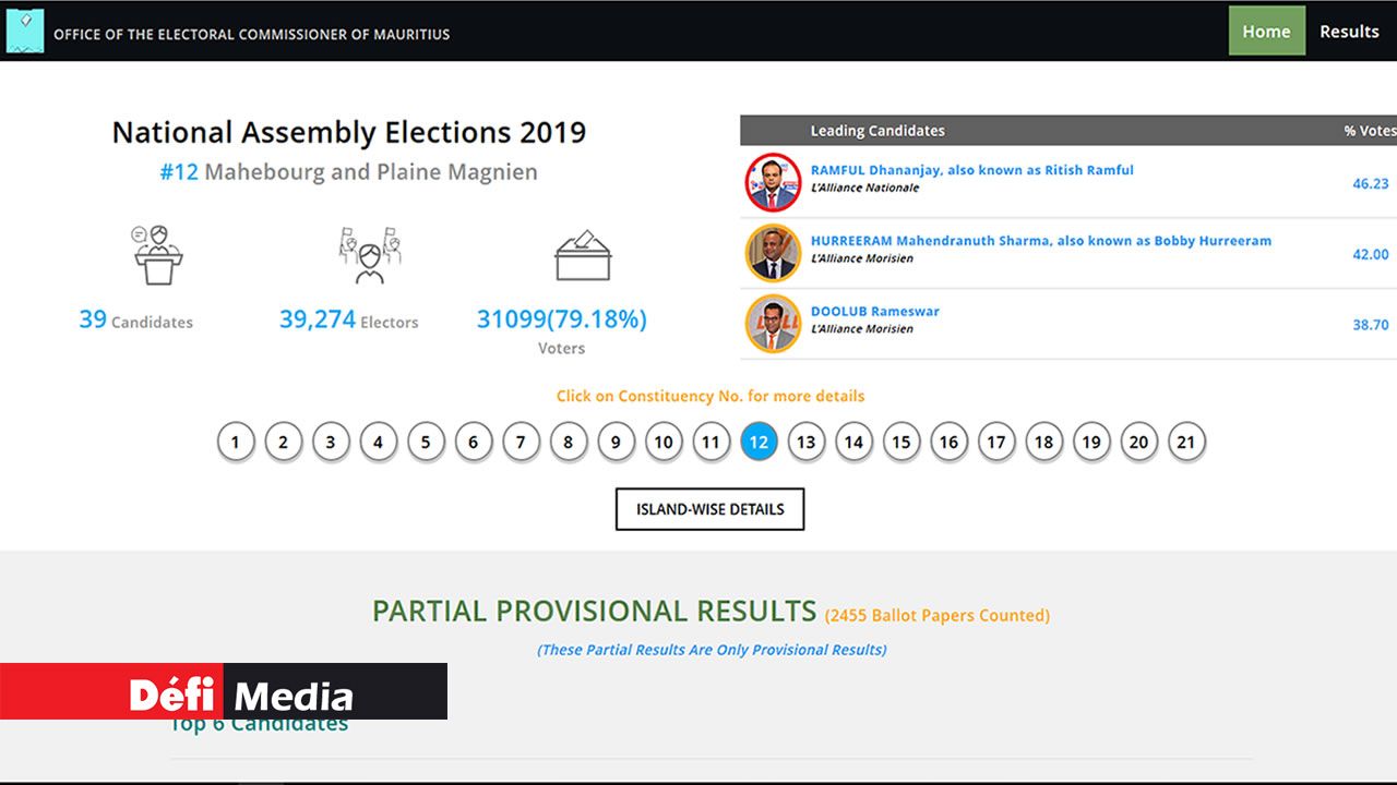 Ritish Ramful de l’Alliance Nationale est en tête dans la circonscription no 12 (Mahébourg/Plaine-Magnien), après le premier pointage, ce vendredi après-midi, 8 novembre.