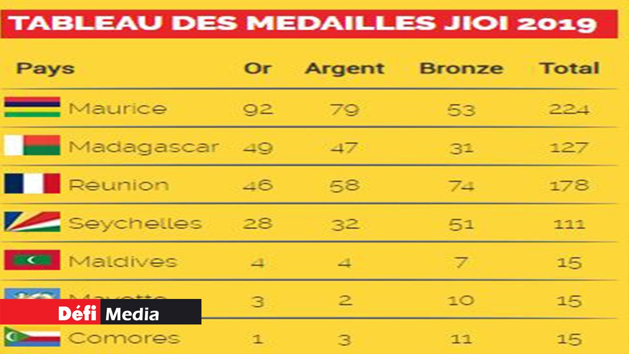 Maurice termine largement en tête au tableau des médailles. Avec 92 médailles d’or, 79 médailles en argent et 53 médailles en argent, notre pays boucle cette dernière journée des Jeux avec 224 médailles au compteur. Madagascar est second avec un total de 127 médailles (49 médailles en or, 47 médailles en argent et 31 médailles en bronze). La Réunion termine troisième du podium avec 178 médailles (46 médailles en or, 48 médailles en argent et 74 médailles en bronze).