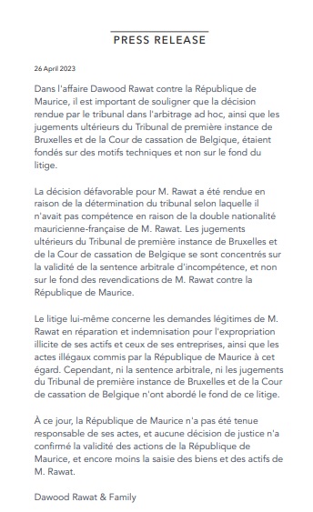 Dans un communiqué émis ce mercredi 26 avril, Dawood Rawat affirme que la Cour s'est concentrée sur la validité de la sentence, plutôt que sur le fond des revendications contre la République de Maurice.