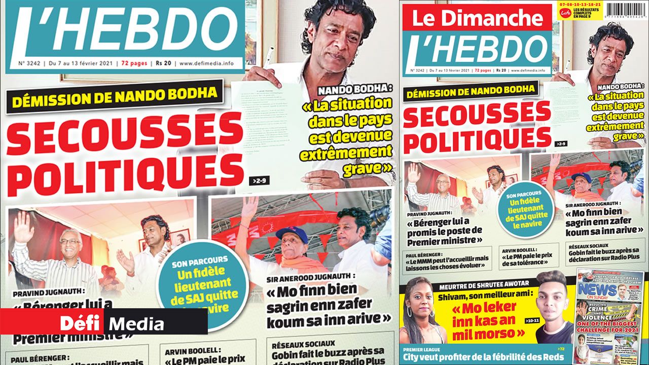 ? Voici la Une de Le Dimanche-L'Hebdo. Le journal est en vente à Rs 20 l'exemplaire aux endroits habituels (supermarchés, boutiques, tabagies, superettes). Bonne lecture !