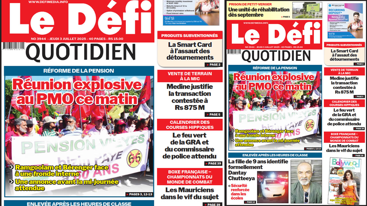 ? Voici la Une du Défi Quotidien. Le journal est en vente à Rs 15 l'exemplaire aux endroits habituels (supermarchés, boutiques, tabagies, superettes). Bonne lecture !