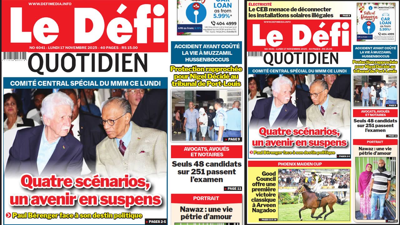 ? Voici la Une du Défi Quotidien. Le journal est en vente à Rs 15 l'exemplaire aux endroits habituels (supermarchés, boutiques, tabagies, superettes). Bonne lecture !