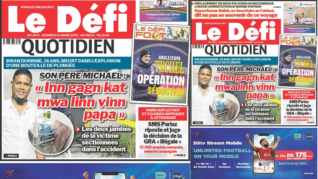? Voici la Une du Défi Quotidien. Le journal est en vente à Rs 15 l'exemplaire aux endroits habituels (supermarchés, boutiques, tabagies, superettes). Bonne lecture !